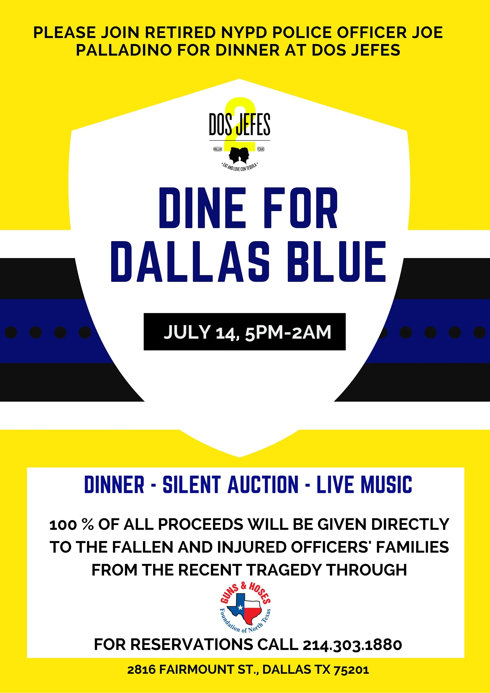 Retired NYPD Officer Joe Palladino and well respected restaurant owner has partnered with 105.3 The Fan for a special live broadcasting of the Ben & Skin show at the newly opened Dos Jefes, to raise funds for the families of fallen officers from the Dallas Police Department, DART Police, and SMU Police Department.